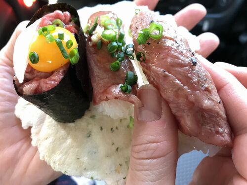 まいど憶良(おくら)です。 岐阜県は高山にやって来ました。 高山では有名な持ち帰り専用にして 飛騨牛の肉寿司専門店。 行列の出来るお店です。 メニュー数も多くない、お値段も、安くはない。 でも、美味しいんです。 お得な三種盛り。 3つで1000円…