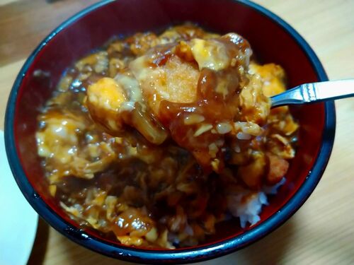 まいど憶良(おくら)です。 実は今回、カツ丼をもう一種類作ってます。 カレーカツ丼です。 前回と出汁のところまでは同じ。 カレールーがあったので溶けやすいようにみじん切りに。 溶かしたら水溶き片栗粉でとろみもつけます。 溶き卵を入れたら、 ほら、…