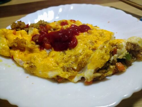 まいど憶良(おくら)です。 真夜中ですが、ちょっと小腹がすきました。 有名メーカーの冷凍食品、カレーチャーハンがありましたので作ろうかと。 ただ、マズイわけではないんですが飽きるんですよね。 そこでちょっと目先を変えましょう。 面倒なので 玉子…